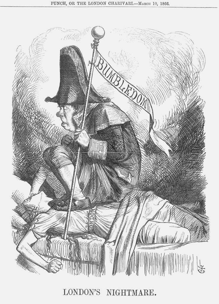 'London's Nightmare', 1866. A man holding banner with the word Bumbledom on it, sits on the chest of a woman representing London. He has a particularly stupid expression on his face. Bumbledom was the term used to encapsulate 'the conflicting jurisdictions of folks who ought to have no jurisdiction at all, and who job, blunder, squabble, and utterly misgovern the metropolis of the world'. Bumbledom was thus seen as stifling the capital. From Punch, or the London Charivari, March 10, 1866.