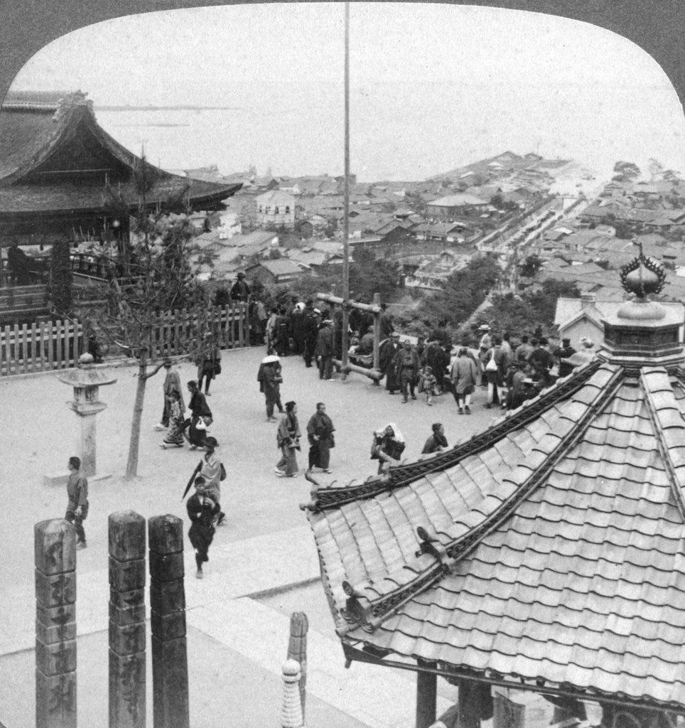 Looking east from Mildera temple over Otsu and lake Biwa, Japan, 1904. Stereoscopic card. Detail. From a series called Notes of Travel.