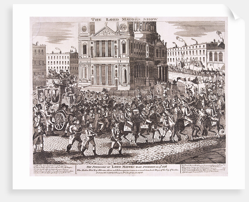Scene of Lord Mayor Matthew Wood's procession passing St Paul's Cathedral, on Lord Mayor's Day, 1816, when he was sworn in a second time as Lord Mayor; with a key to the figures below.