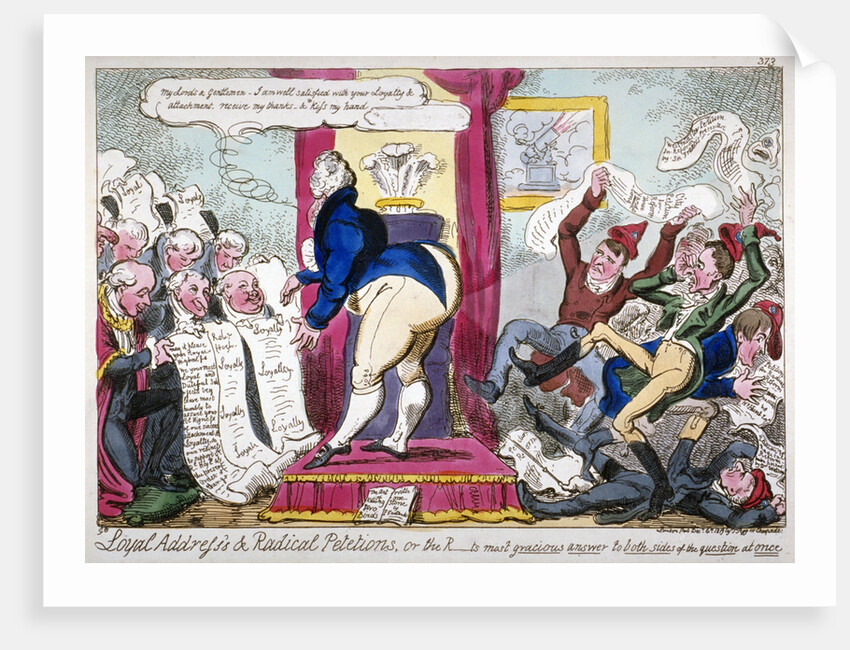 'Loyal Address's & Radical Petitions, or the R-ts most gracious answer to both sides of the question at once', 1819. The Prince Regent standing on a dais, facing City aldermen and other subjects who are kneeling obsequiously to present loyal addresses. Radical petitioners are staggering back from the blast issuing from the Regent's posterior.