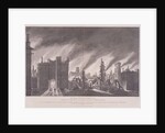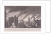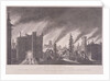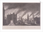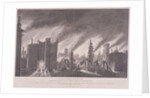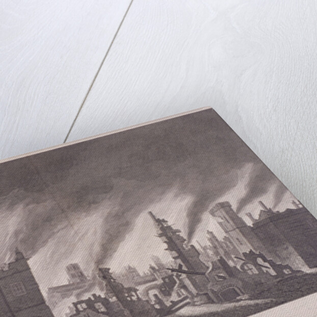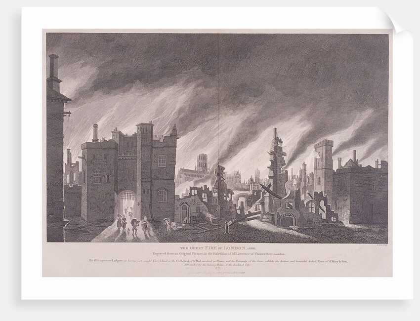 View of Ludgate having just caught fire as a result of the Great Fire of London 1666, London, 1811. The view shows St Paul's Cathedral and St Mary-le-Bow with families on the move.