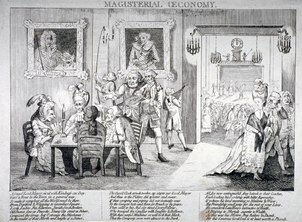 'Magisterial oeconomy ...', 1779. A reception at Mansion House. The clock shows it to be midnight, and the Lord Mayor directs the footmen to extinguish the candles with bellows and snuffers. A satire on the parsimony of Lord Mayor Plumbe during his mayoralty.