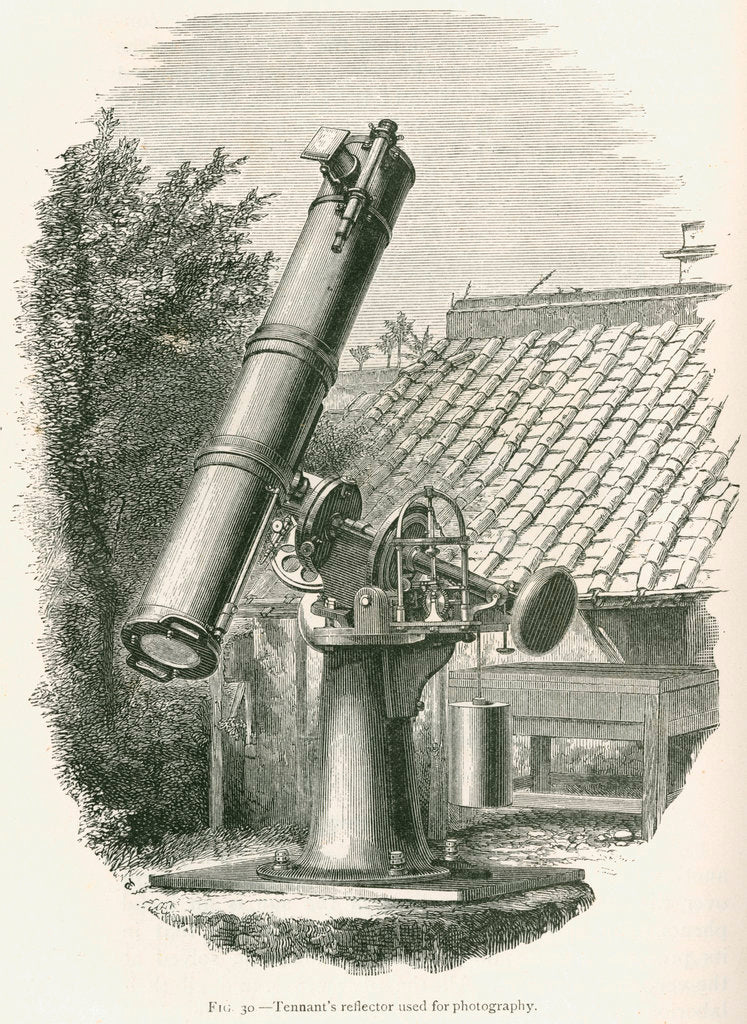 Illustration of a reflecting telescope used in India to photograph a solar eclipse in 1868, from Contributions to solar physics, by J Norman Lockyer (London, 1874).