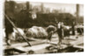 Making leather in the lime yard at Neckinger Mills, London, 20th century. Goatskins being soaked in water in pits of about seven feet deep before being placed in limewater to remove the hair.