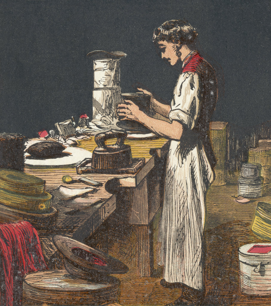 Making silk hats, 1867. The hatter is covering a hat frame with black silk. To his left on the bench is an iron for smoothing out the fabric. In the centre background are two finished hats covered in silver paper for protection. Illustration from a children's book. (London, 1867).