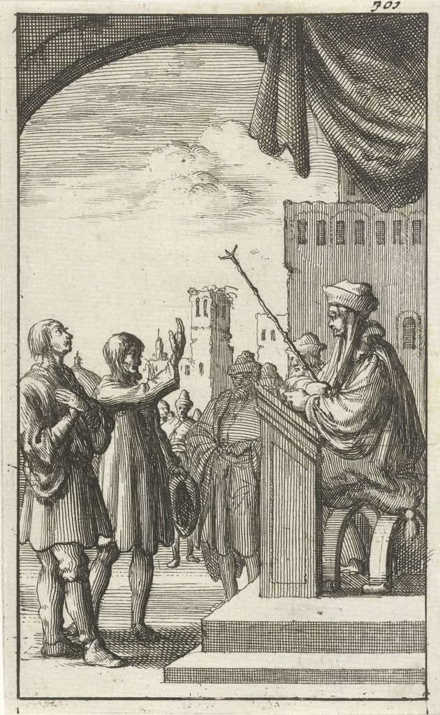 Man makes an oath in court, Jan Luyken, Jan Bouman, 1685