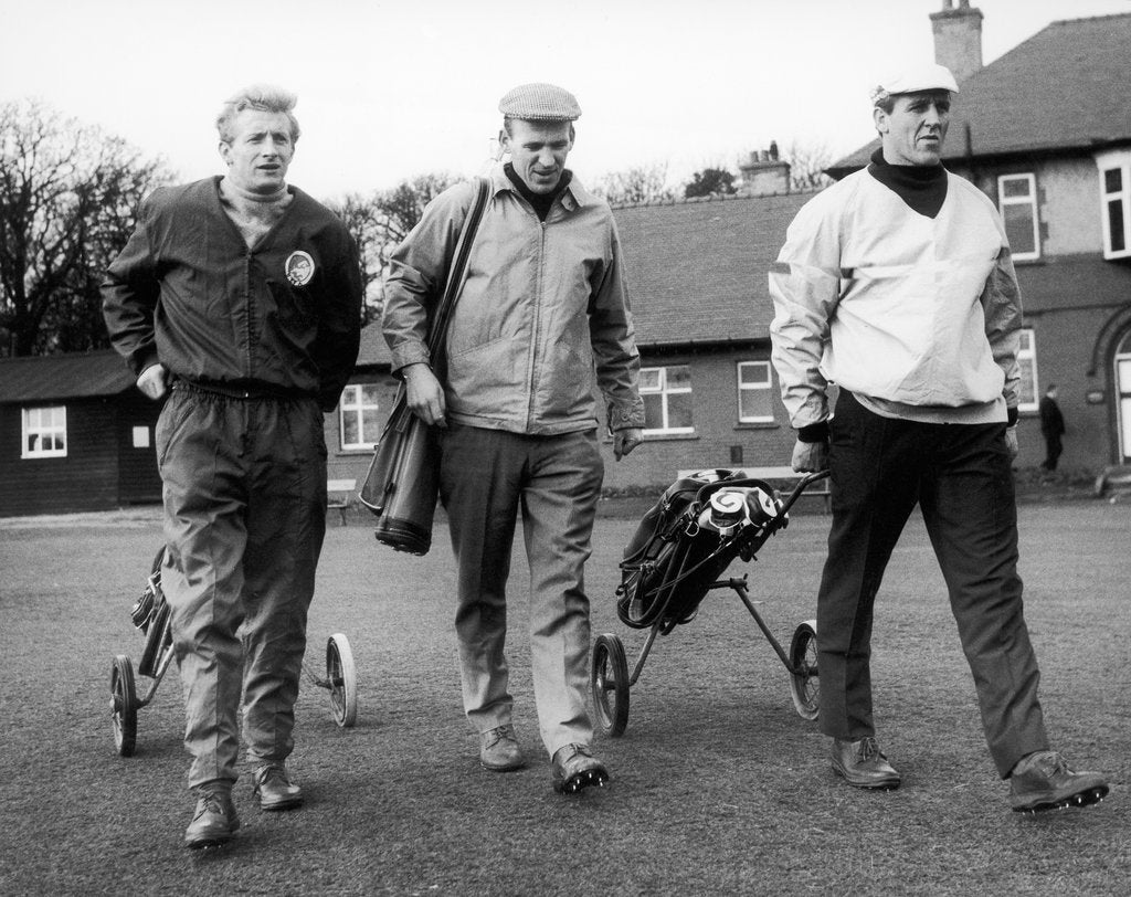 Manchester United players on the golf course at Fairhaven. l-r Denis Law, Patrick 'Paddy' Crerand and Maurice Setters. 16th November 1964.