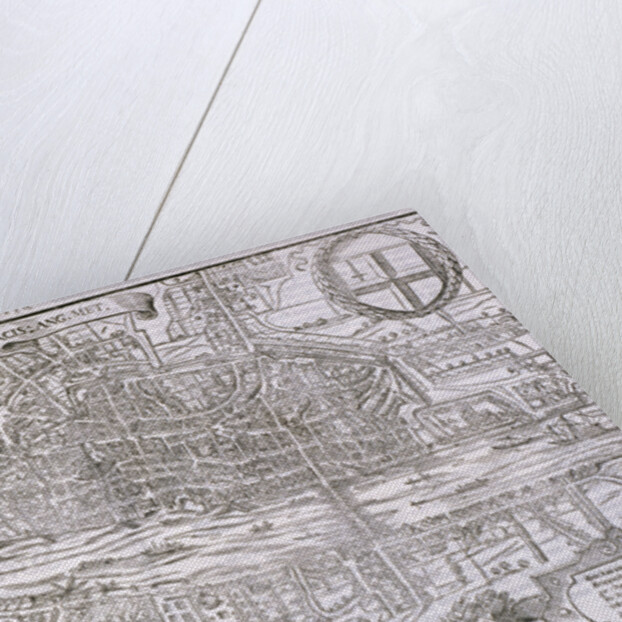 Map of the City of London and City of Westminster with four figures in the foreground, (c1572?). Heraldic shield on left depicts the Tudor royal arms and shield on left depicts the City of London arms.