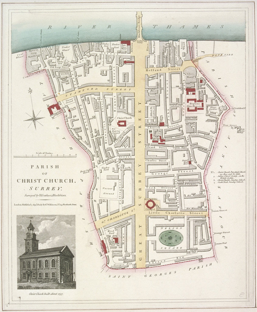 Map of the Parish of Christ Church in Southwark, London, 1821. With an image of the church inset in the bottom left corner.