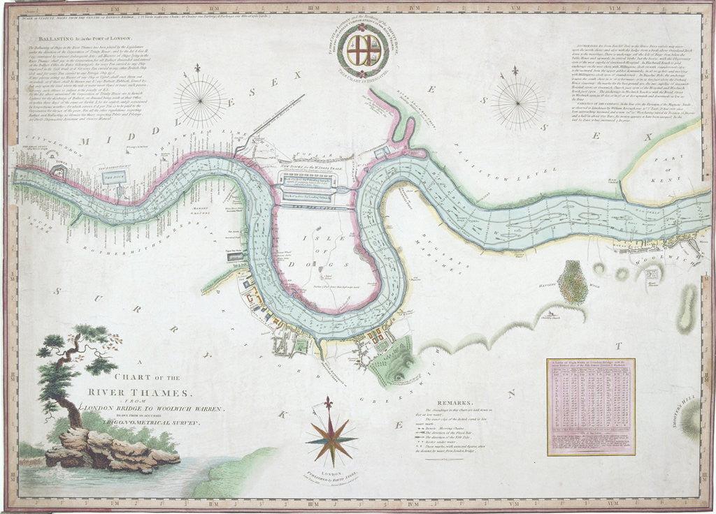 Map of the River Thames from London Bridge to Woolwich, 1802. Showing river depths and sandbanks.