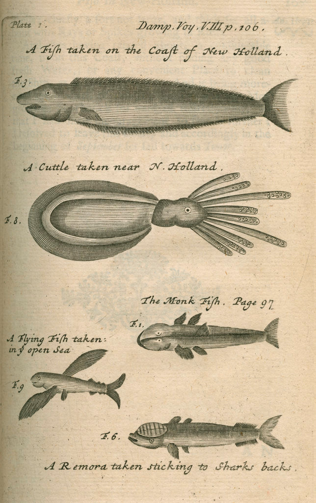 Five studies of creatures observed by William Dampier during his voyage to Australia [New Holland] in 1699. Figure 1 [inscribed 'F.3'] captioned: 'A Fish taken on the Coast of New Holland.' Figure 2 [Inscribed 'F8'] captioned: 'A Cuttle taken near N.Holland.' Figure 3 [inscribed 'F.1'] captioned: 'The Monk Fish. Page 97.' Figure 4 [inscribed 'F.9'] captioned 'A Flying Fish taken: in the open Sea.' Figure 5 [inscribed 'F.6'] captioned 'A Remora taken sticking to Sharks backs.' Plate 1 facing p.106 in: A voyage to New-Holland, &c. In the Year 1699...by William Dampier; within volume 3 of A collection of voyages..., by William Dampier et.al., 4 volumes, (London, James and John Knapton, 1729). Copy belonging to Sir Joseph Banks (1743-1820), President of the Royal Society.