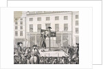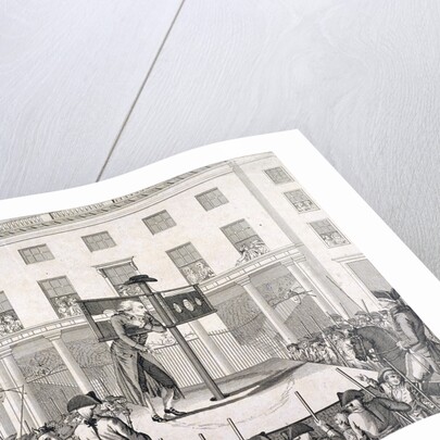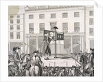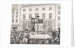 Mark Lane, London, 1783. Christopher Atkinson in the pillory outside the Corn Exchange, London, in the presence of the Sheriffs. Also showing crowds gathered on the street and looking out from windows at the event in Mark Lane.