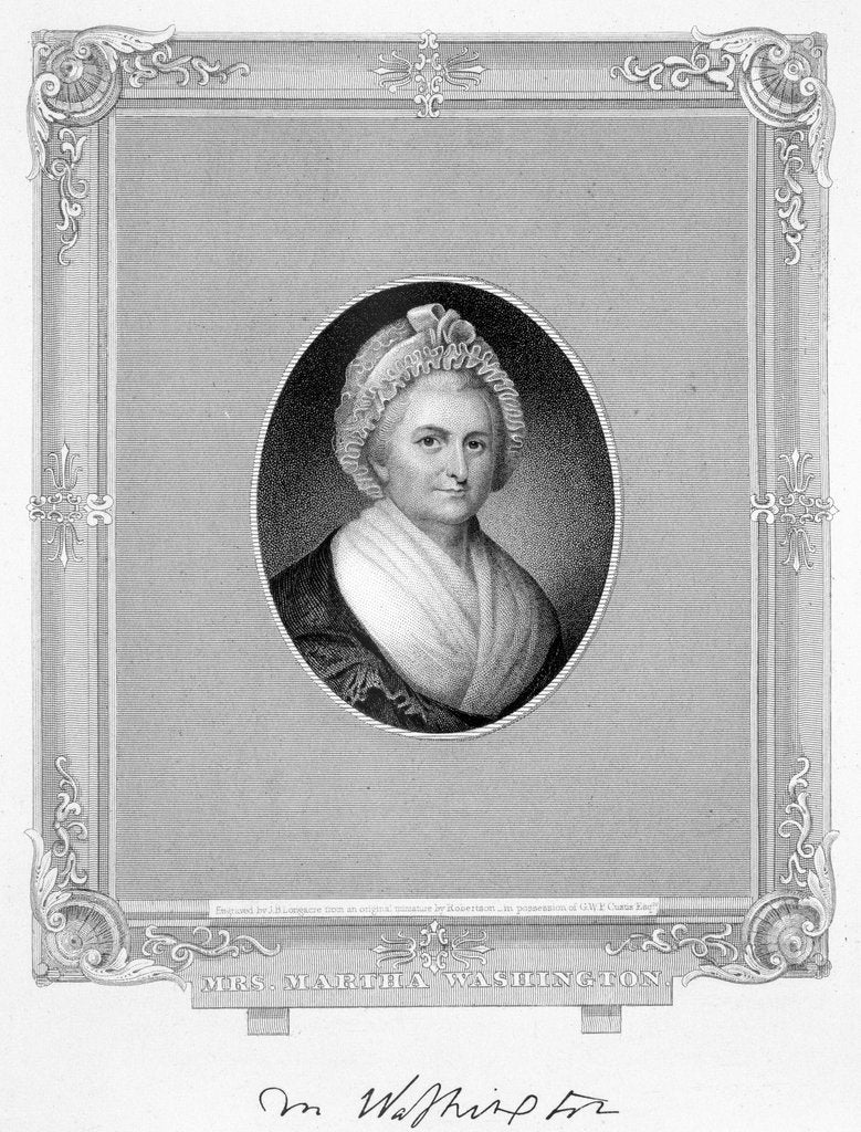Martha Washington, wife of US President George Washington, (19th century). The daughter of a Virginia plantation owner, Martha Dandridge (1731-1802) married George Washington in 1759. Although the title was not used during her lifetime, she is today regarded as the first First Lady of the United States.