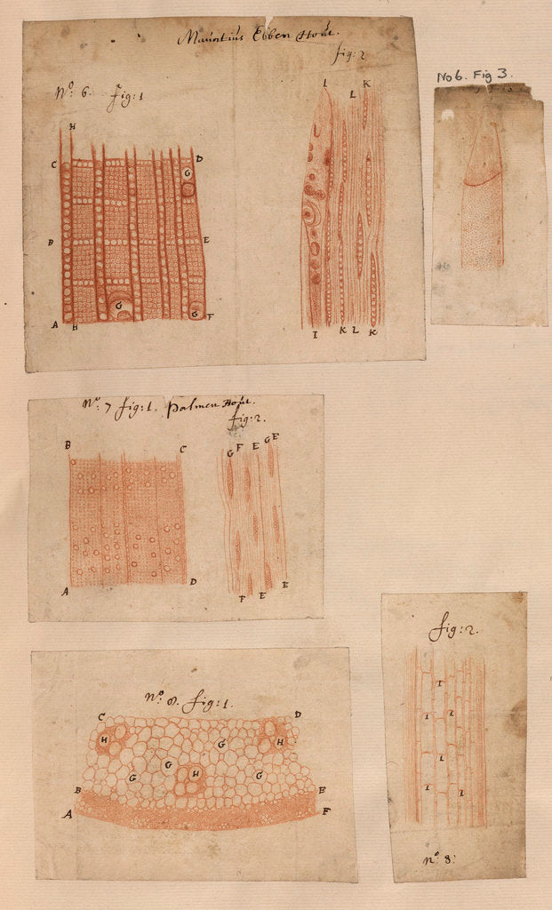 Illustrations accompanying a letter describing Antoni van Leeuwenhoek's microscopical observations, dated 12 January 1680. An English extract of the letter was printed in Philosophical Transactions of the Royal Society, 13 (1683), pp. 197-208. The figures show: fibres in a section of ebony cut crosswise (no. 6, fig. 1) and lengthwise (no. 6, figs. 2 and 3); fibres in a section of boxwood cut crosswise (no. 7, fig. 1) and lengthwise (no. 7, fig. 2); a section of straw cut crosswise (no. 8, fig. 1) and the exterior of the straw (no. 8, fig. 2).