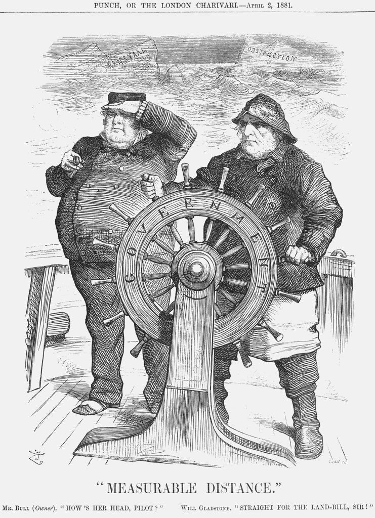 Measurable Distance, 1881. Mr John Bull, the representative of the British people is the owner of the ship which the pilot, Prime Minister Gladstone, is attempting to steer into safe harbour. In the background can be seen the various hazards that have been encountered along the way, and the contentious Land Bill is looming. This bill proposed to implement fair rents which would be assessed by a semi-judicial procedure. This would, however, represent a larger measure of interference with private property in Ireland than had previously been the case. From Punch, or the London Charivari, March 12, 1881.