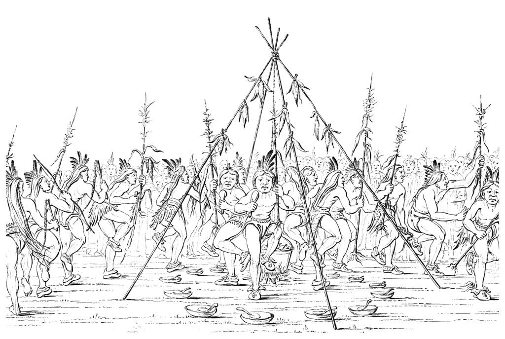Medicine men dance around a cooking pot giving thanks to the Great Spirit