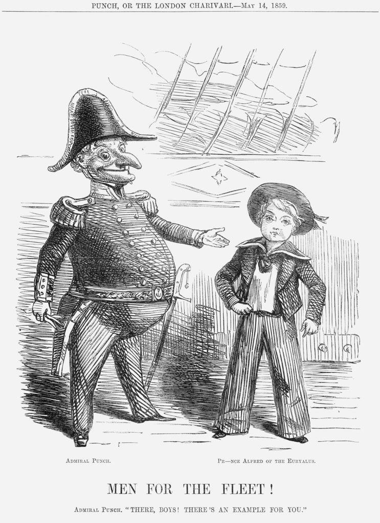 'Men for the Fleet!', 1859. In May 1959, Prince Alfred, Queen Victoria's second son, was appointed aboard HMS 'Euryalus'. Although he is depicted as a child in this cartoon, he would have been about 15 years old at the time of his appointment. From Punch, or the London Charivari, May 14, 1859.