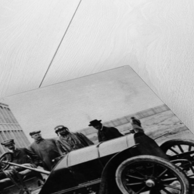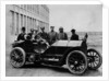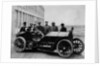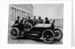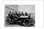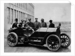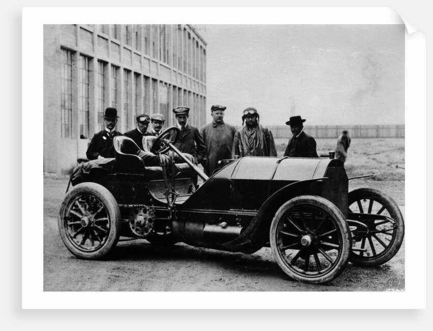 Mercedes 90 hp car, c1930-c1904. A group of men stand behind the car. Among them is Camille Jenatzy (second from left), one of the first professional racing drivers and his fellow Belgian racing driver Baron Pierre de Caters (fourth from left). It was planned that 90 hp cars be entered in the 1904 Gordon Bennett Race, but they were destroyed in a major fire at Daimler's factory in Cannstatt, Germany.