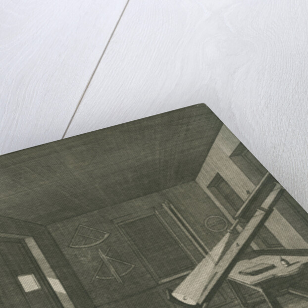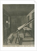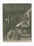 Interior view of a darkened chamber at the old Royal Observatory building, with a refracting telescope projecting an image of the Sun. The observatory was completed in 1676: in that year there were both solar eclipses and a transit of Mercury. Plate 3 (left half detail) from Ichnographia speculae Regiae Grenovici exquisite facta (London, 1676) a series of engravings commissioned by Sir Jonas Moore, the leading force in the construction and equipping of the original Royal Greenwich Observatory. The plate bears the inscription: 'Domus Obscurata ad Maculas, Eclipsesque Solares Excipiendas, peropportuna '. Sir Jonas Moore (1617-1679) mathematician and patron of astronomy was elected a Fellow of the Royal Society in 1674.