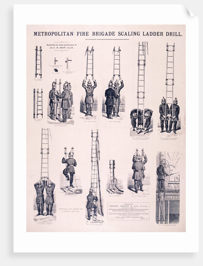 View showing the different stages of the Metropolitan Fire Brigade scaling ladder drill, 1873.