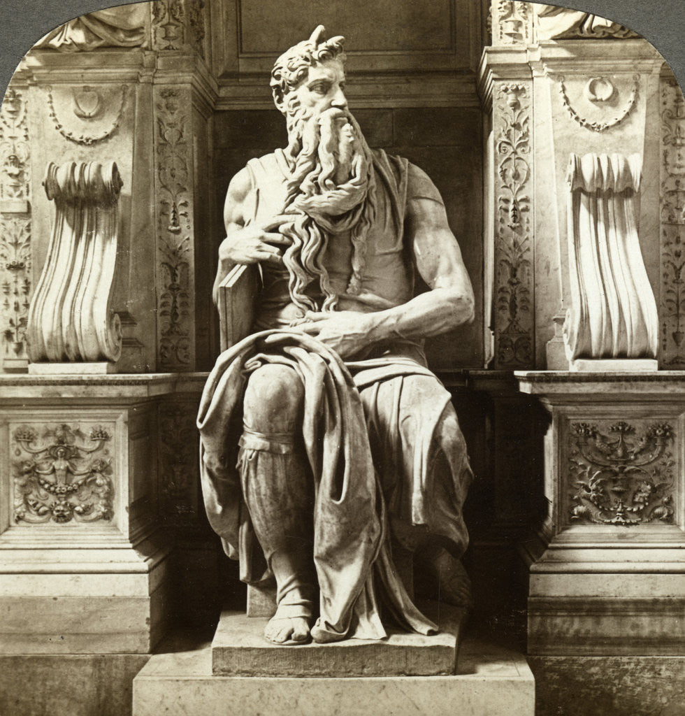 Michelangelo's statue of Moses, Church of San Pietro in Vincoli, Rome, Italy. This statue was intended to be the central feature of the tomb of Pope Julius II, which Michelangelo was commissioned to build in 1505. The tomb was supposed to be in the Cappella Maggiore in St Peter's Basilica, but it was never completed to Michelangelo's satisfaction and was moved to the Church of San Pietro in Vincoli. Stereoscopic card detail.