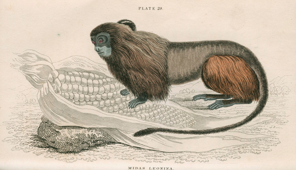 Zoological study of a pygmy marmoset Cebuella pygmaea native to South America. Shown in profile with its forelimbs resting on an ear of maize as an indicator of scale. Plate 29 from The natural history of monkeys, by Sir William Jardine (Edinburgh, 1833) The Naturalist's Library. Mammalia. Vol.1. Referred to in the text as 'The Leonine Tamarin'. The plate is inscribed: 'PLATE 29. MIDAS LEONINA. Lizars sc.'