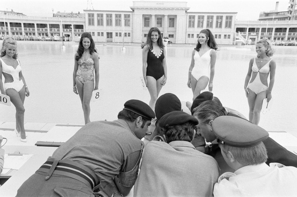 Miss Blackpool 1971, Beauty Competition Heat 4. Model and winner, Miss Carolyn Moore 18 from Nantwich, Cheshire, pictured with contest judges from the 12th Light Air Defence Regiment. 24th June 1971. In August 1971, Carolyn was also crowned Miss Great Britain 1971. Officers & Judges : Lt Richard Burdon of London. Sgt. Royston Bevan of Cardiff. Bombardier Robert Miler of Capetown. Lance Bombardier Ed Ferguson of Glasgow. Gunner Peter Hodkinson of Blackburn.