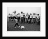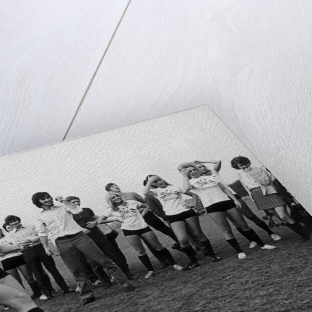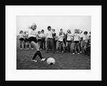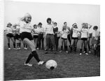 Miss Eva Haralsted takes a penalty shot under the watchful eye of fiancee George Best, Alan Ball and other members of the team Blinkers United