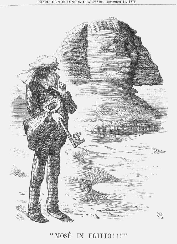 Mosé in Egitto !!!, 1875.The Conservative Prime Minister, Disraeli, holds the key to India. This relates to the purchase by Britain's government of the Suez Canal shares. Egypt's Khedive had tried to sell them to a French company but when negotiations broke down, he offered them to the British government. This was accepted with some alacrity as shown by Disraeli's rather smug expression. The Suez Canal was often known as the key of India. From Punch, or the London Charivari, December 11, 1875.