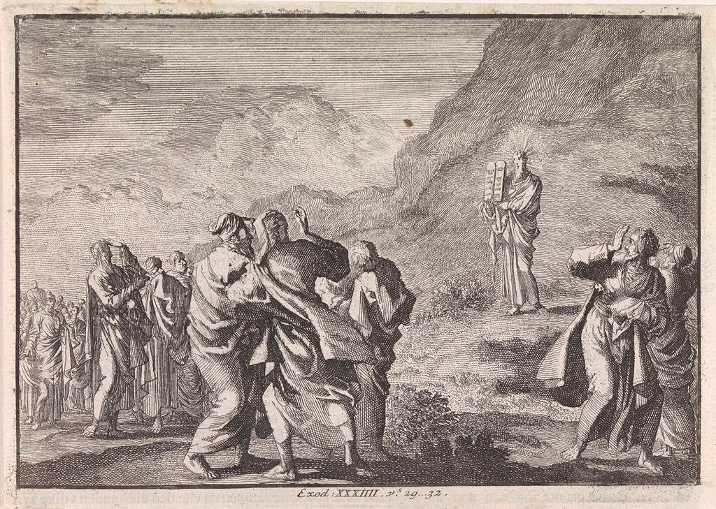 Moses received the law tables and displays them to the people, Jan Luyken, Pieter Mortier, 1703 - 1762