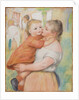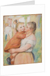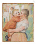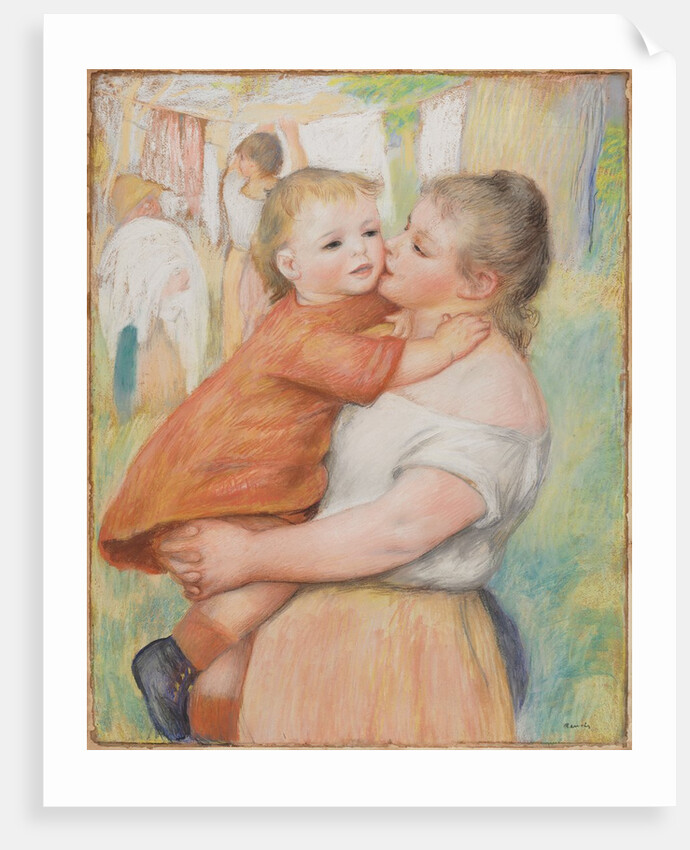Mother and Child, 1886. In this idealization of motherhood and rural life, Renoir depicts his future wife, Aline Charigot, with their son Pierre. The pastel is a confection of bright colours: warm orange and yellow are contrasted with cool blues and greens, creating a chromatically exuberant image. Renoir took full advantage of pastel?s unique optical properties, in which minute, irregular particles diffusely reflect light, allowing for an unparalleled velvety brilliance that is perfectly suited to portray the youthful bloom of the woman and child.