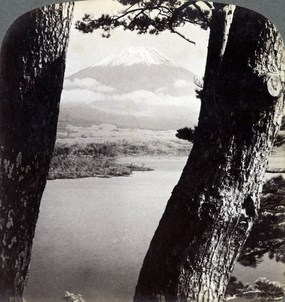 Mount Fuji, seen from the northwest, through pines at Lake Motosu, Japan, 1904. Stereoscopic card. Detail.