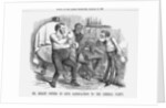 'Mr. Bright offers to give satisfaction to the Liberal Party', 1858. Mr John Bright (on the left) had made a speech at Manchester in which he forcefully reiterated his well-known views on the subjects of the aristocracy, parliamentary reform, and the duty of the Liberal Party. Bright was a Quaker and many of his writings were filled with a prosy religiosity. However, he was arguably one of the great orators of his age, allowing himself to express sarcasm and irony in equal measure. One of the points of his speech, according to Punch was that 'it [was] the Independent Liberals who habitually save the country by making Government impossible'. His attack on the Liberal Party is illustrated by Russell stemming the flow from his bloodied nose, and Mr Bright dances lightly around, inviting Russell to come and get him - if he can. From Punch, or the London Charivari, December 18, 1858.