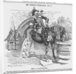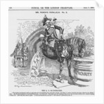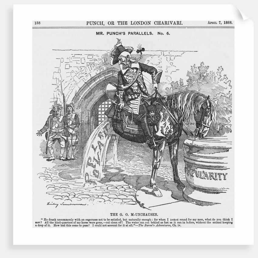 'Mr. Punch's Parallels. No. 6', 1888. This cartoon depicts the Liberal Leader of the Opposition, William Gladstone, astride his horse. The horse is drinking from the fountain of Popularity, but unfortunately, the water is spilling out of him as fast as he can take it in. From Punch, or the London Charivari, April 7, 1888.