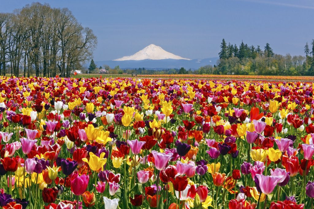 Product images of Mt.Hood over tulips field, Wooden Shoe Tulip Farm, Woodburn Oregon. have property release.
