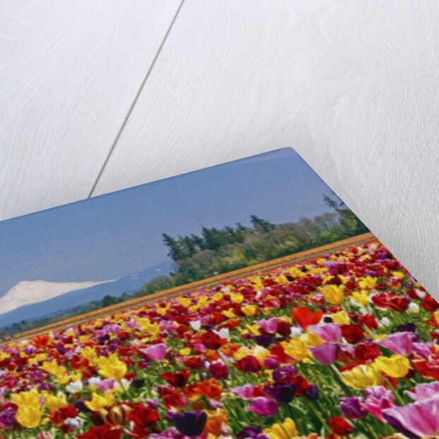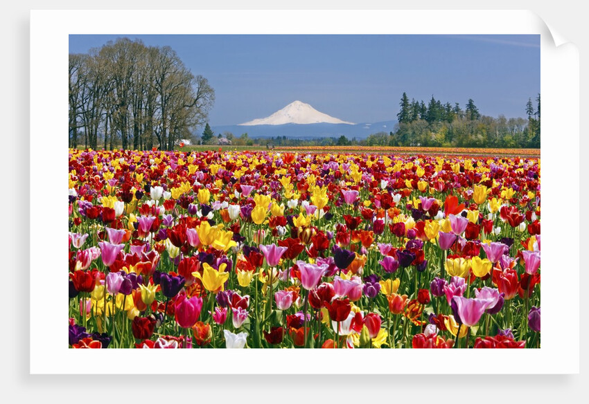 Product details Mt.Hood over tulips field, Wooden Shoe Tulip Farm, Woodburn Oregon. have property release.