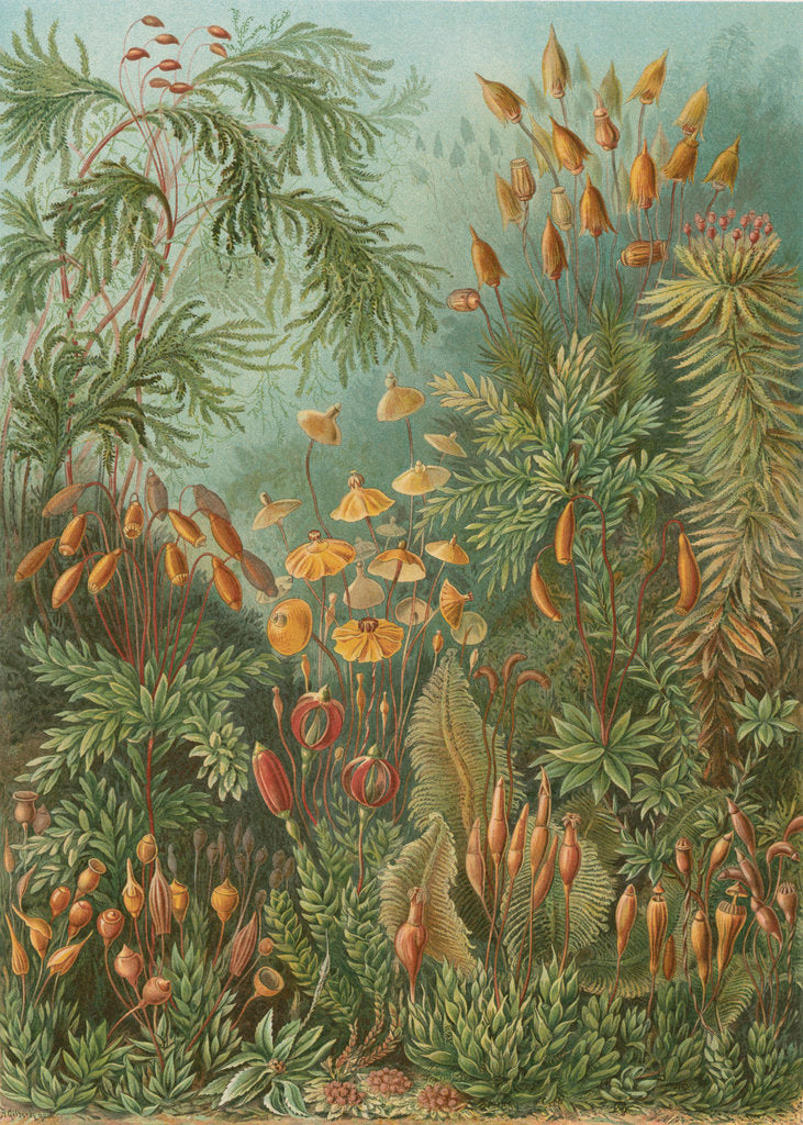 Sixteen botanical studies, figures of bryophytes set within a landscape. Figure 1 Thamnium alopecurum. Figure 2 Eurhynchium praelongum. Figure 3 Polytrichum commune. Figure 4 Sphagnum cymbifolium. Figure 5 Splachnum luteum. Figure 6 Mnium undulatum. Figure 7 Rhodobryum roseum. Figure 8 Physcomitrium acuminatum. Figure 9 Physcomitrium ericetorum. Figure 10 Physcomitrium sphaericum. Figure 11 Sphagnum medium. Figure 12 Andreaea thedenii. Figure 13 Hypnum castrense. Figure 14 Tetraplodon urceolatus. Figure 15 Dissodon hornschuchii. Figure 16 Dissodon froelichii. Plate 72 from the book Kunstformen der natur by Ernst Haeckel (Leipzig, Wien, Bibliographische Institut, 1899-1904).