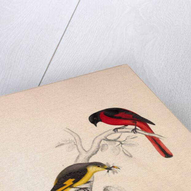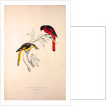 Muscipeta Brevirostris. Birds from the Himalaya Mountains, engraving 1831 by Elizabeth Gould and John Gould. John Gould was working as a taxidermist,he was known as the 'bird-stuffer', by the Zoological Society. Gould's fascination with birds from the east began in the late 1820s when a collection of birds from the Himalayan mountains arrived at the Society's museum and Gould conceived the idea of publishing a volume of imperial folio sized hand-coloured lithographs of the eighty species, with figures of a hundred birds. Elizabeth Gould made the drawings and transferred them to the large lithographic stones. They are called Gould plates.