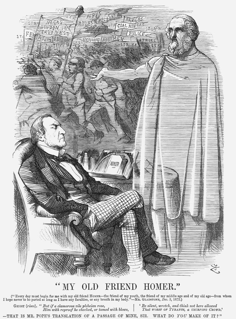 My Old Friend Homer, 1872. Mr Gladstone, the Liberal Prime Minister, was known to read Homer regularly, and here, the ghost of the great man has come to ask Gladstone how he could allow his authority to be usurped by the masses. This relates to the outbreak of a number of strikes during the year. These included bakers, carpenters, the Metropolitan Police and London's gas-workers. From Punch, or the London Charivari, December 14, 1872.
