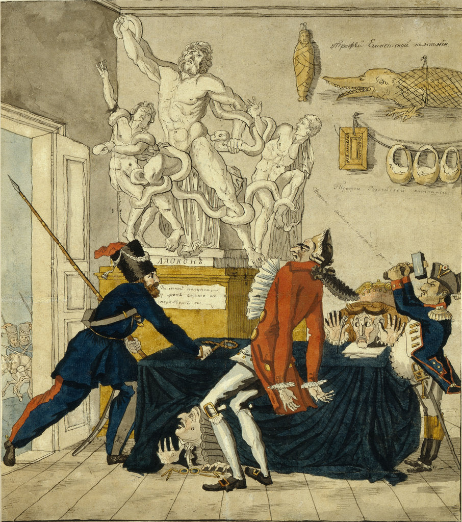 Napoleon Bonaparte selling Stolen Goods, 1813. Found in the collection of the State Tretyakov Gallery, Moscow.