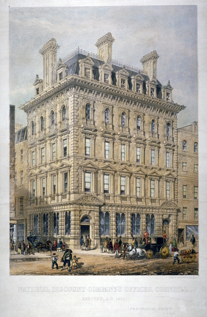 National Discount Company's offices, Cornhill, City of London, 1857. View showing figures and carriages in the street.