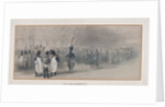 The National Guard on Parade at The Tuileries, 1846?. A large number of soldiers gather together, while in the background are figures on horseback and a smart building.