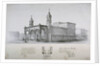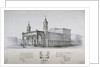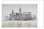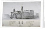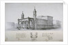 New Royal Exchange, City of London, 1839. View showing an alteration to the west front of design no 43 for the new Royal Exchange. Also showing figures and adjacent buildings. Below is a ground plan.