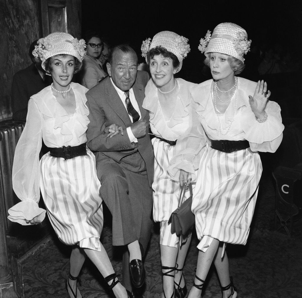 Kay Kendall left, enjoying a dance with ( left to right) Noel Coward, Joyce Grenfell and Margaret Leighton during rehearsals for the 'Night Of 100 Stars' charity performance at the London Palladium. 22nd July 1958