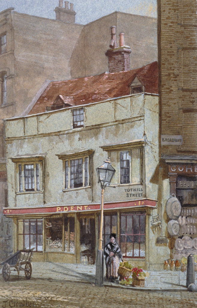 No 1 Tothill Street, Westminster, London, c1880. View showing a street seller standing by a lamppost at the junction of Tothill Street and Broadway.