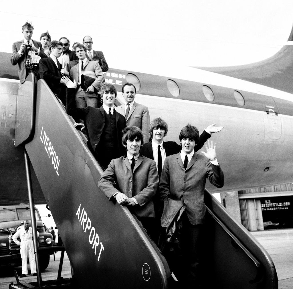 Northern premier of The Beatles film "A Hard Day's Night". John Lennon, Paul McCartney, Ringo Starr and George Harrison pictured on the steps of the plane in Liverpool on 10th July 1964.