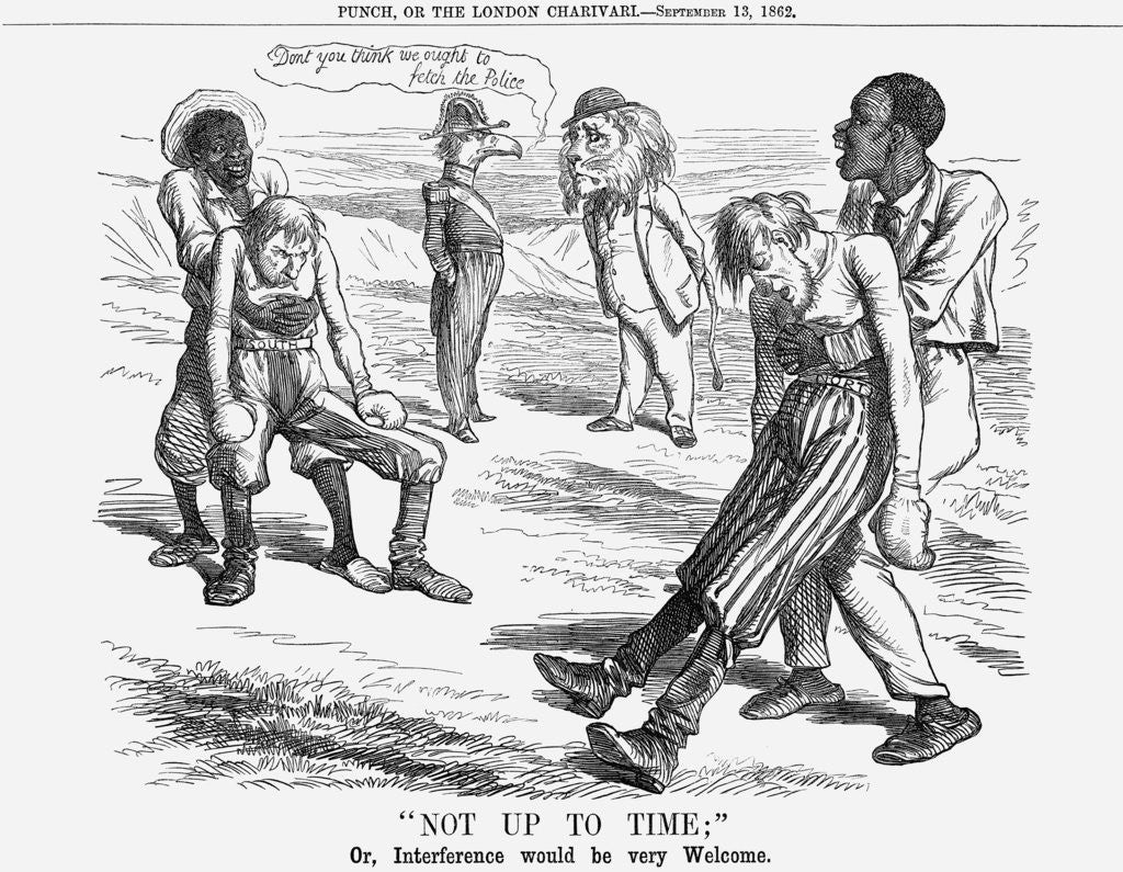 Not Up to Time, 1862. 'Or, Interference would be very Welcome.' By this time, both sides in the American Civil War were struggling for men and money. Here, the British Lion and the French Eagle consider what action they can take to bring the War to a conclusion. Meanwhile, the two Presidents, Davis on the left and Lincoln on the right are supported by slaves to symbolise the central and most bitter argument of the Civil War. From Punch, or the London Charivari, September 13, 1862.