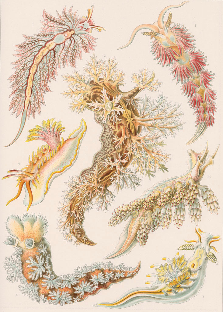 Seven figures of Nudibranches. Figure 1 Hermaea bifida. Figure 2 Aeolis coronate. Figure 3 Dendronotus arborescens. Figure 4 Idalia elegans. Figure 5 Doto coronate. Figure 6 Tritonia hombergii. Figure 7 [numbered 6 in the text, in error] Ancula cristata. Plate 43 from the book Kunstformen der natur by Ernst Haeckel (Leipzig, Wien, Bibliographische Institut, 1899-1904).