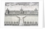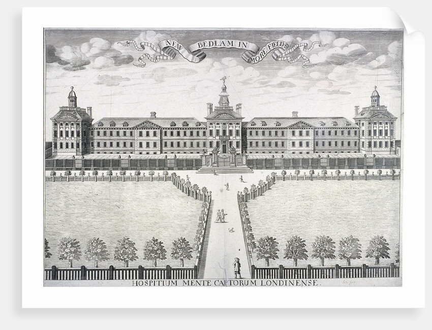 View of Old Bethlehem Hospital, Moorfields, London, c1714, with title on a ribbon in the sky.