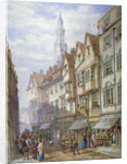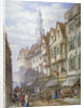 Old houses in Wych Street, Westminster, London, 1873. View looking east showing shop fronts, a man pushing a barrow laden with produce, pedestrians walking along the pavement, a woman balancing a basket of flowers on her head, and a horse-drawn cart in the distance.